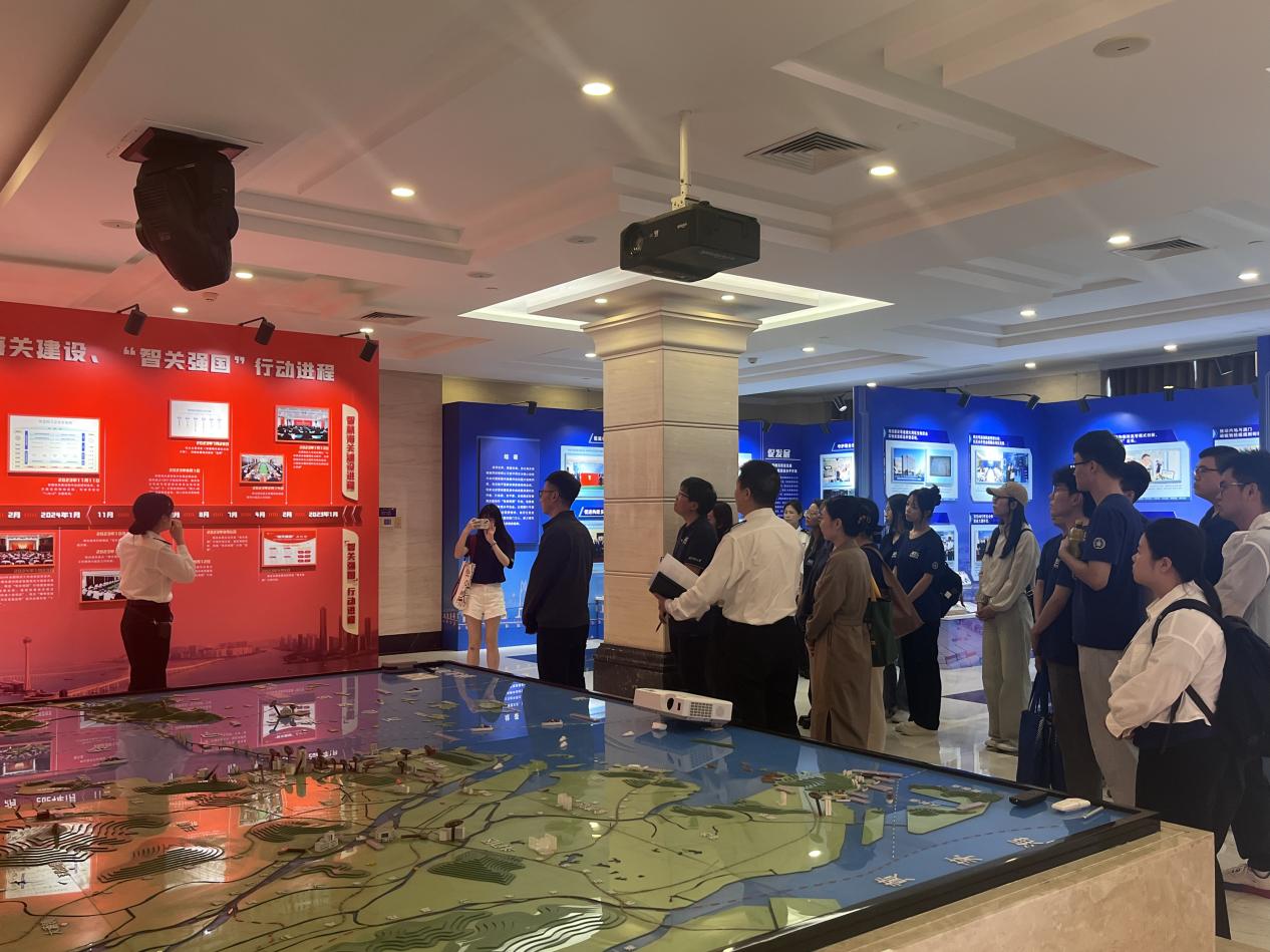 活动首站,参访师生在海关讲解员的引导下,系统观摩了智慧海关建设“智关强国”行动专题展览。展览中集中呈现了拱北海关获优秀改革项目的创新举措、获评全国智慧海关建设的相关项目,让师生们直观感受到海关改革如何通过技术赋能,在提升通关效率、守护国门安全、服务民生需求中发挥关键作用。
