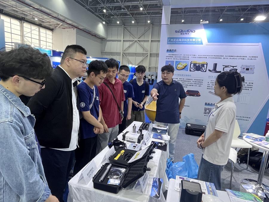 在企业展区,师生们开启了一场精彩纷呈的科技探索之旅。作为国内海洋智能装备领域的领军企业,广州至远海洋科技有限公司带来的无人潜航器、海洋环境监测系统等创新成果令人眼前一亮。企业技术负责人通过动态模型演示与详实数据分析,生动展现了深海探测、海洋资源开发等技术在科研监测、商业开发等多元场景下的应用潜力,深入浅出地勾勒出海洋智能装备产业的广阔前景,让师生们对海洋科技的战略价值与市场潜力有了更为直观且深刻的认识。