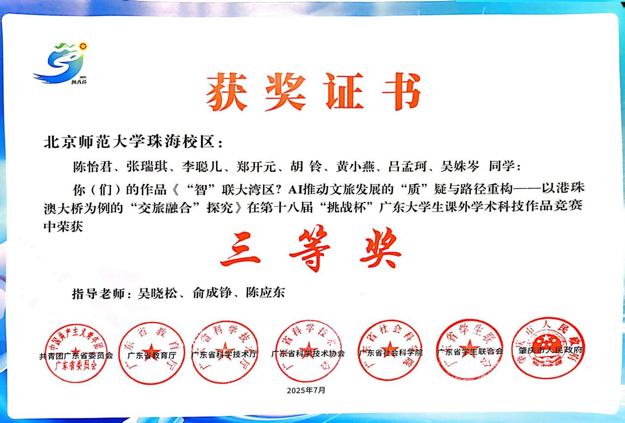 经过网络评审和现场答辩等环节的激烈角逐,由太阳成集团tyc33455cc官网吴晓松、俞成铮、陈应东老师共同指导的员工团队,凭借作品《“智”联大湾区?AI推动文旅发展的“质”疑与路径重构---以港珠澳大桥为例的“交旅融合”探究》脱颖而出,荣获赛事三等奖。